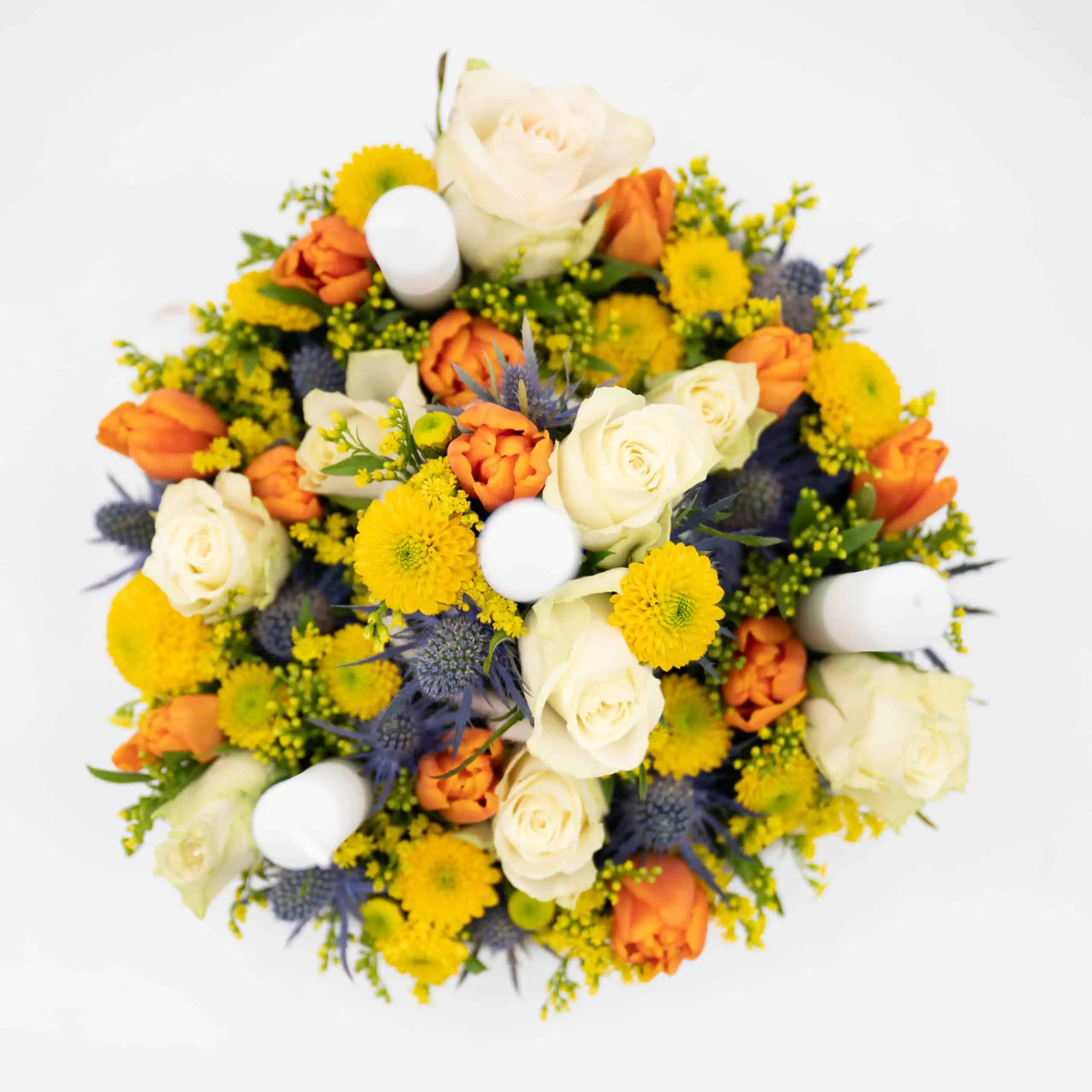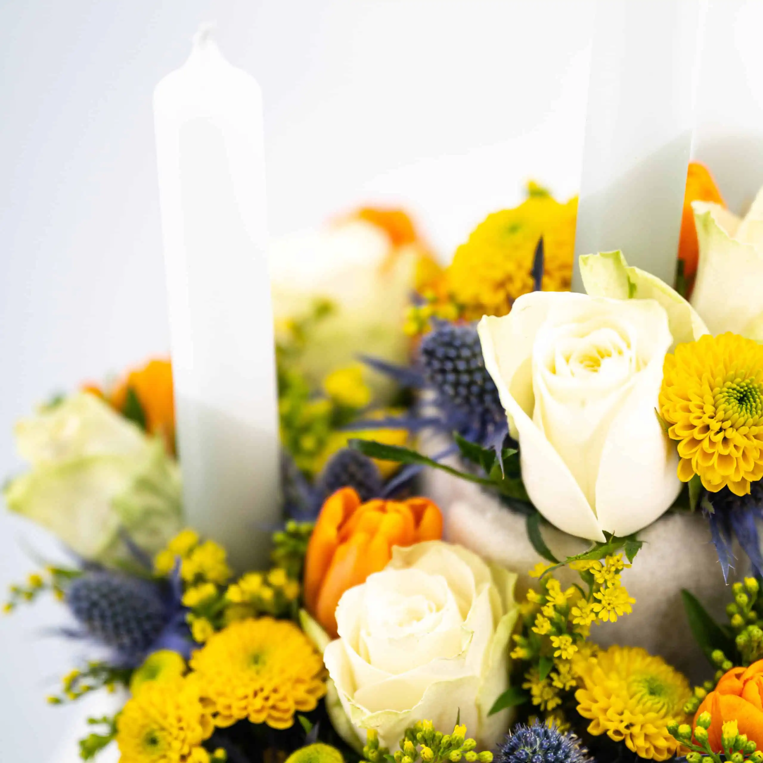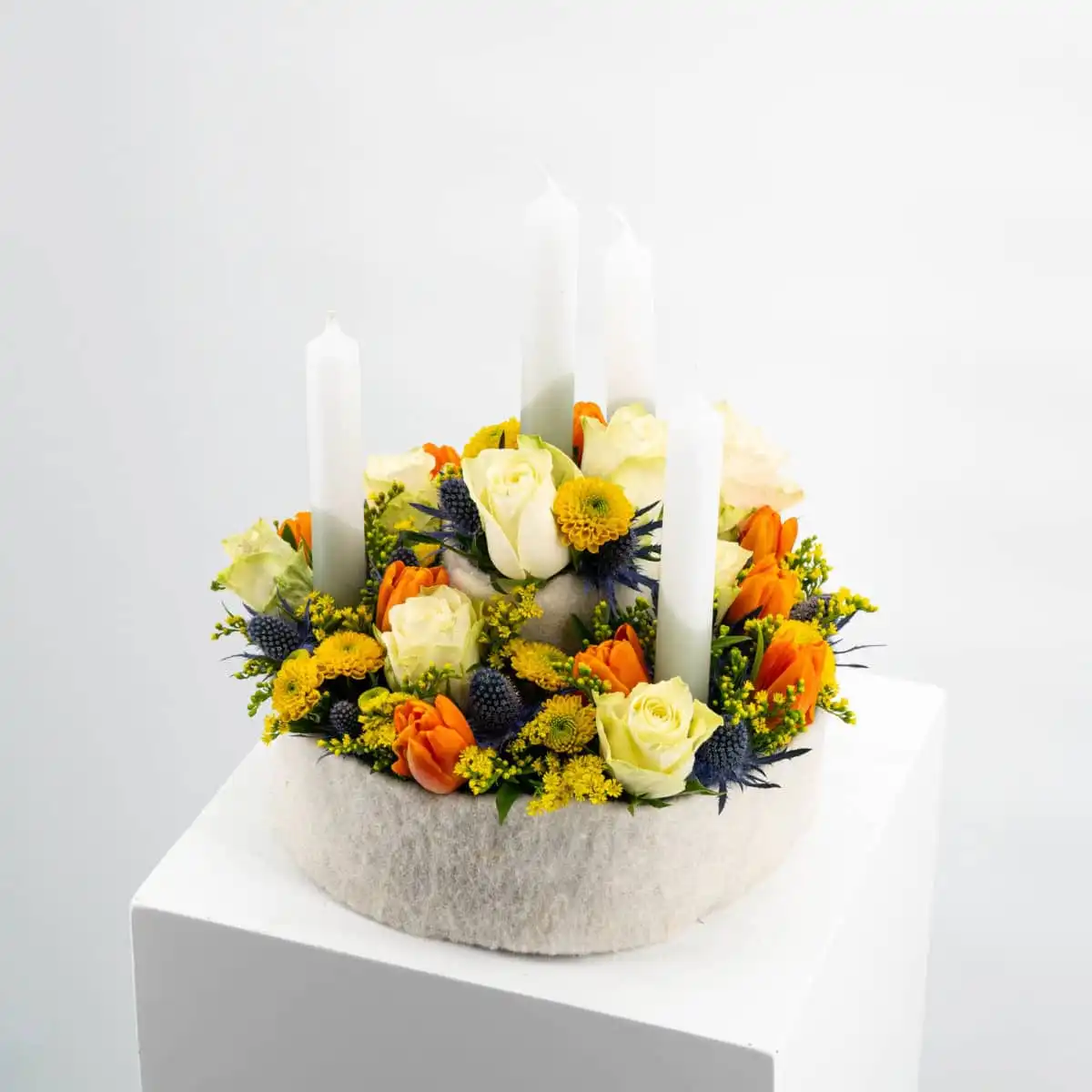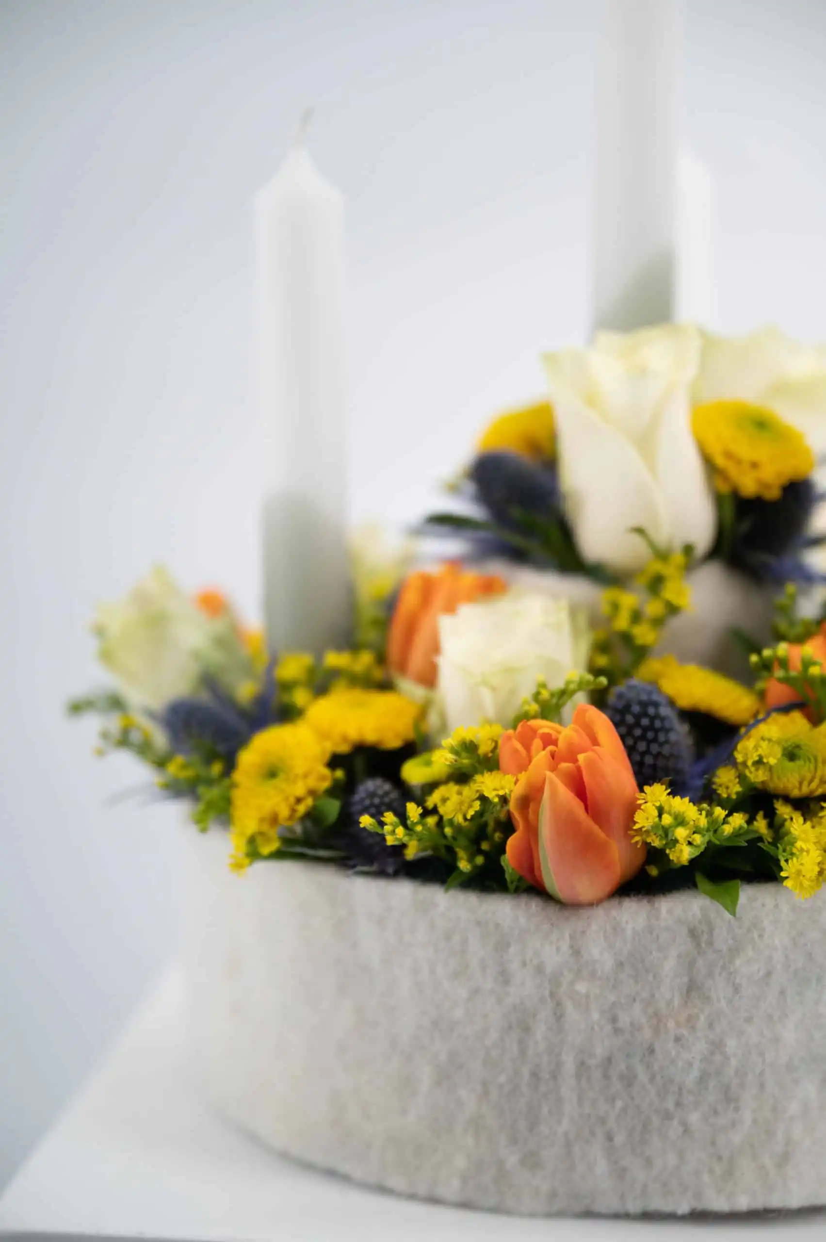 Floral gearbeitete zweistöckige Torte in Frischblumenmosy gesteckt aus Rosen, Tulpen, Disteln, Santini, Solidaster und 4 Stck. eingearbeiteten Spitzkerzen, außen mit cremefarbenden Filzband umwickelt.