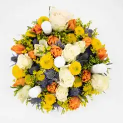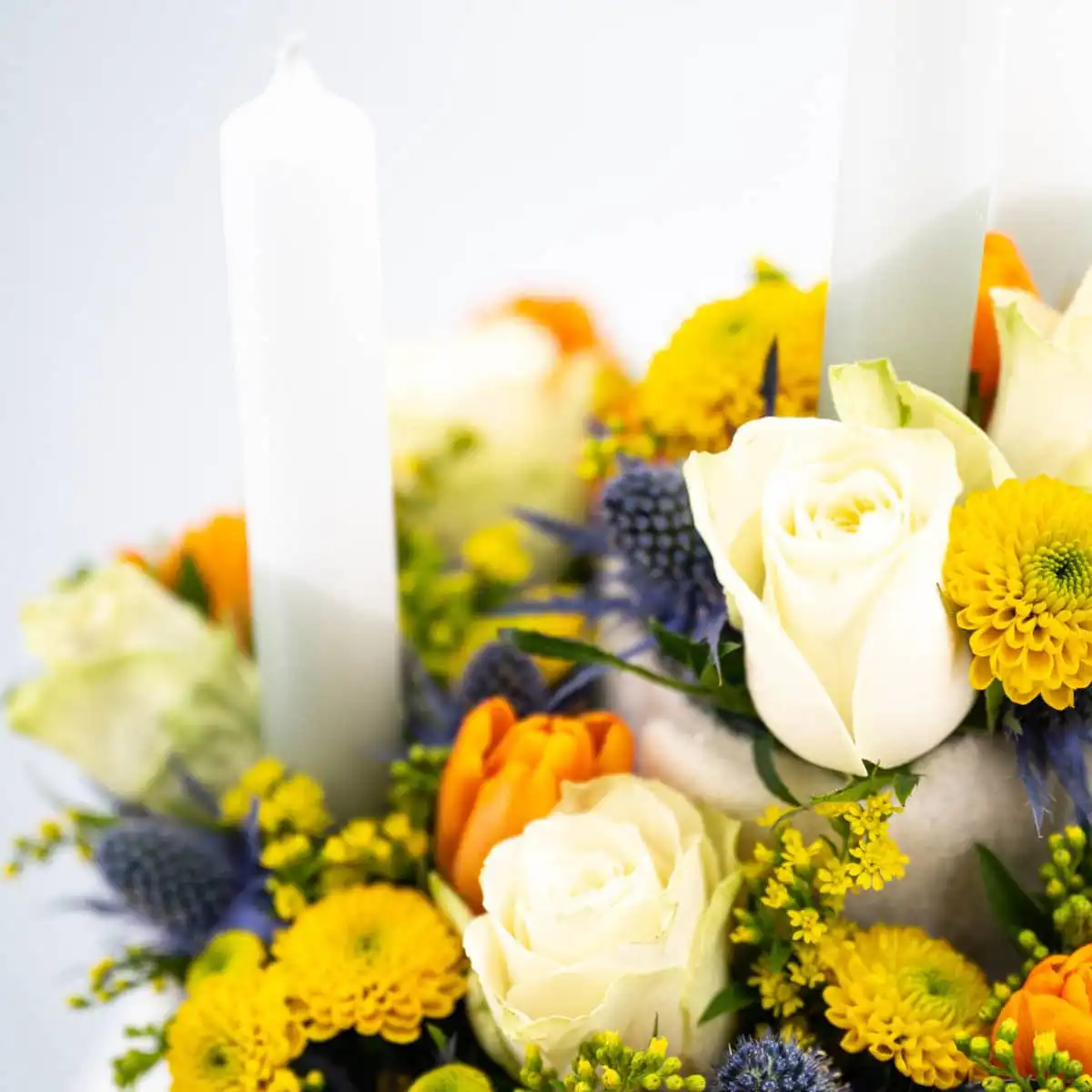 Was für eine Geburtstagsüberraschung! Unsere florale Torte ist ein Meisterwerk, das blumig und floral gute Laune versprüht. In der leuchtenden Farbkombination Gelb-Orange-Blau ist sie der absolute Mittelpunkt auf jedem Geburtstagstisch.