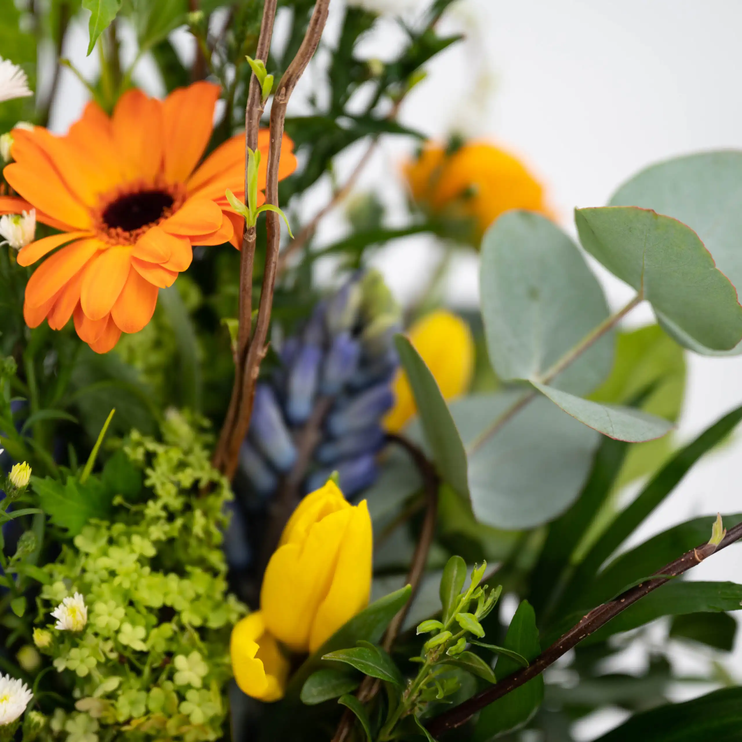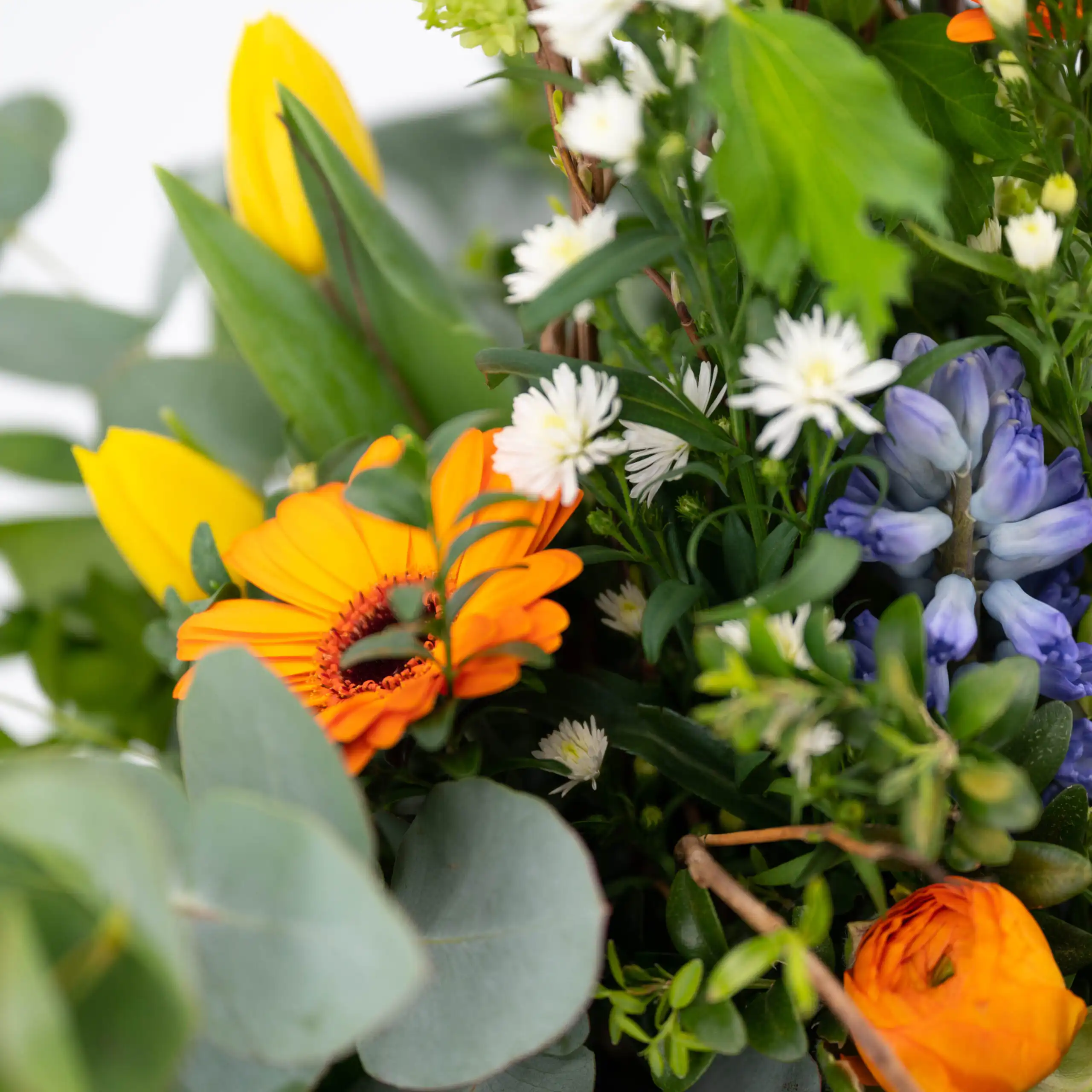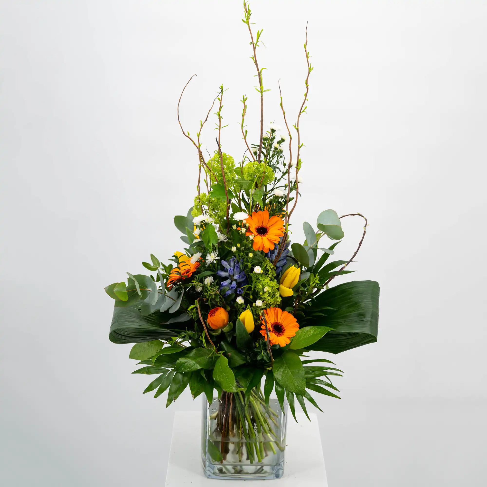 Gestaffelt , hoch gebundener Strauß in den Farben orange, weiß, gelb, blau und grün, mit Salixzweigen, Hyazinten, Mini Gerbera, Viburnum, Tulpen, Eukalyptus, gebogenen Aspedistrablättern, Chico und Salal.