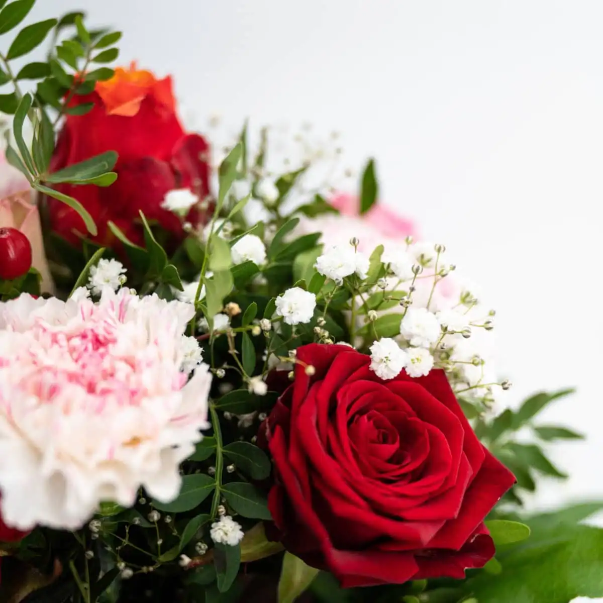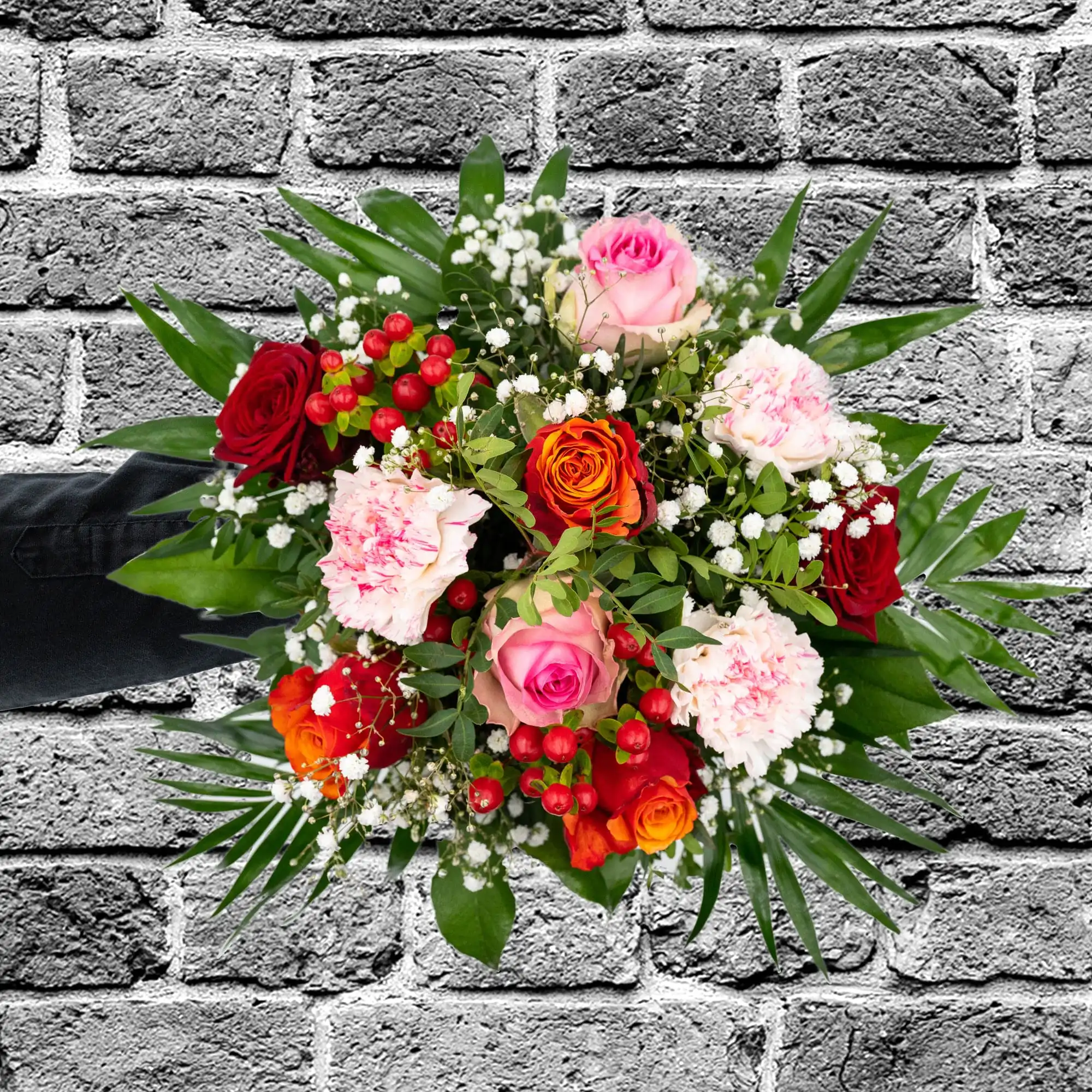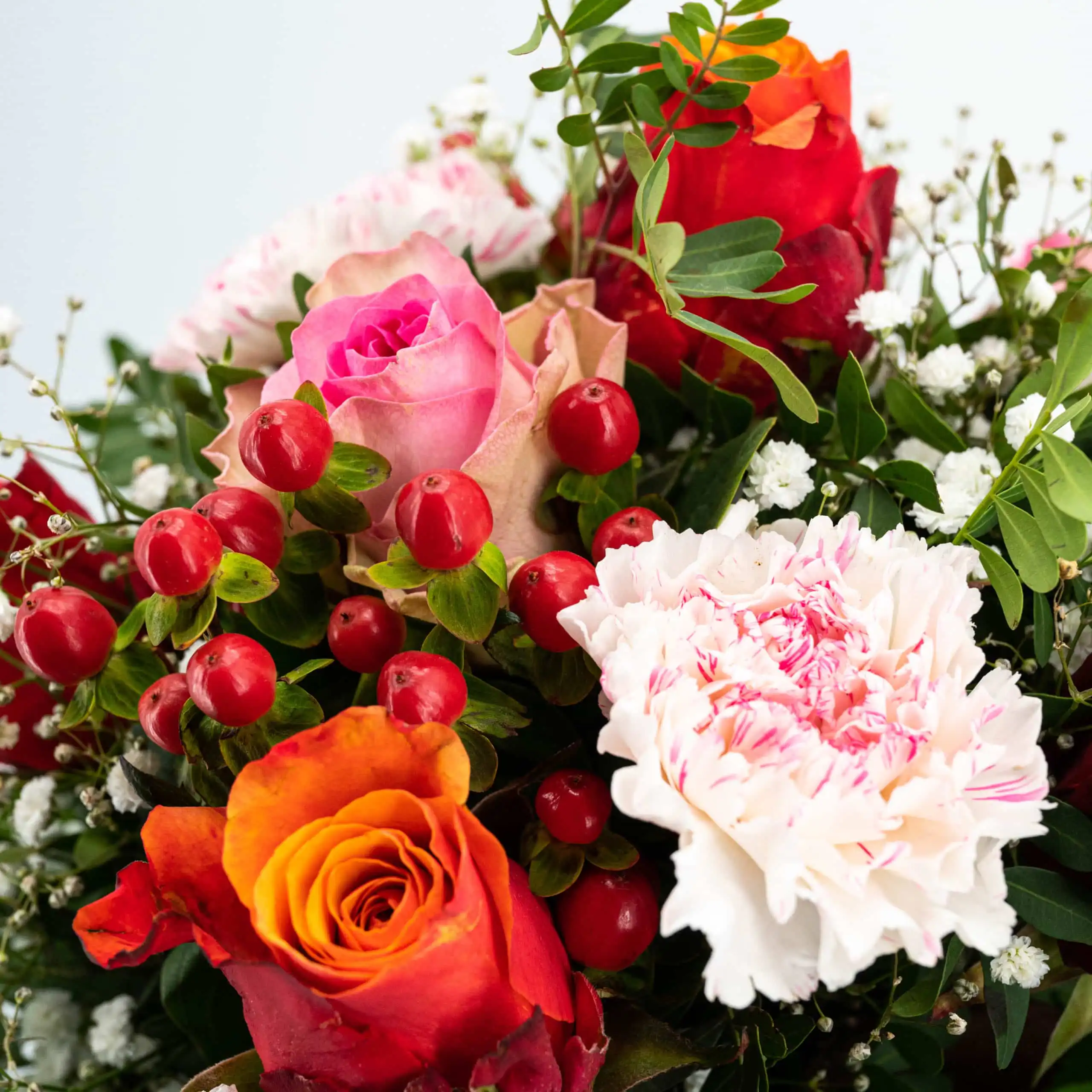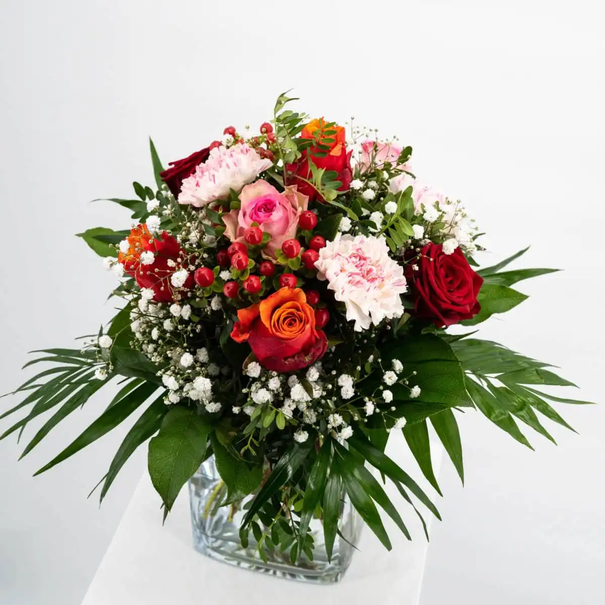 Strauß aus Rosen, Nelken, Schleierkraut und Hyperikum. Als Beiwerk wird Chicco und Salat verwendet. Rundgebunden in den Farben orange, rot, rosa und weiß.