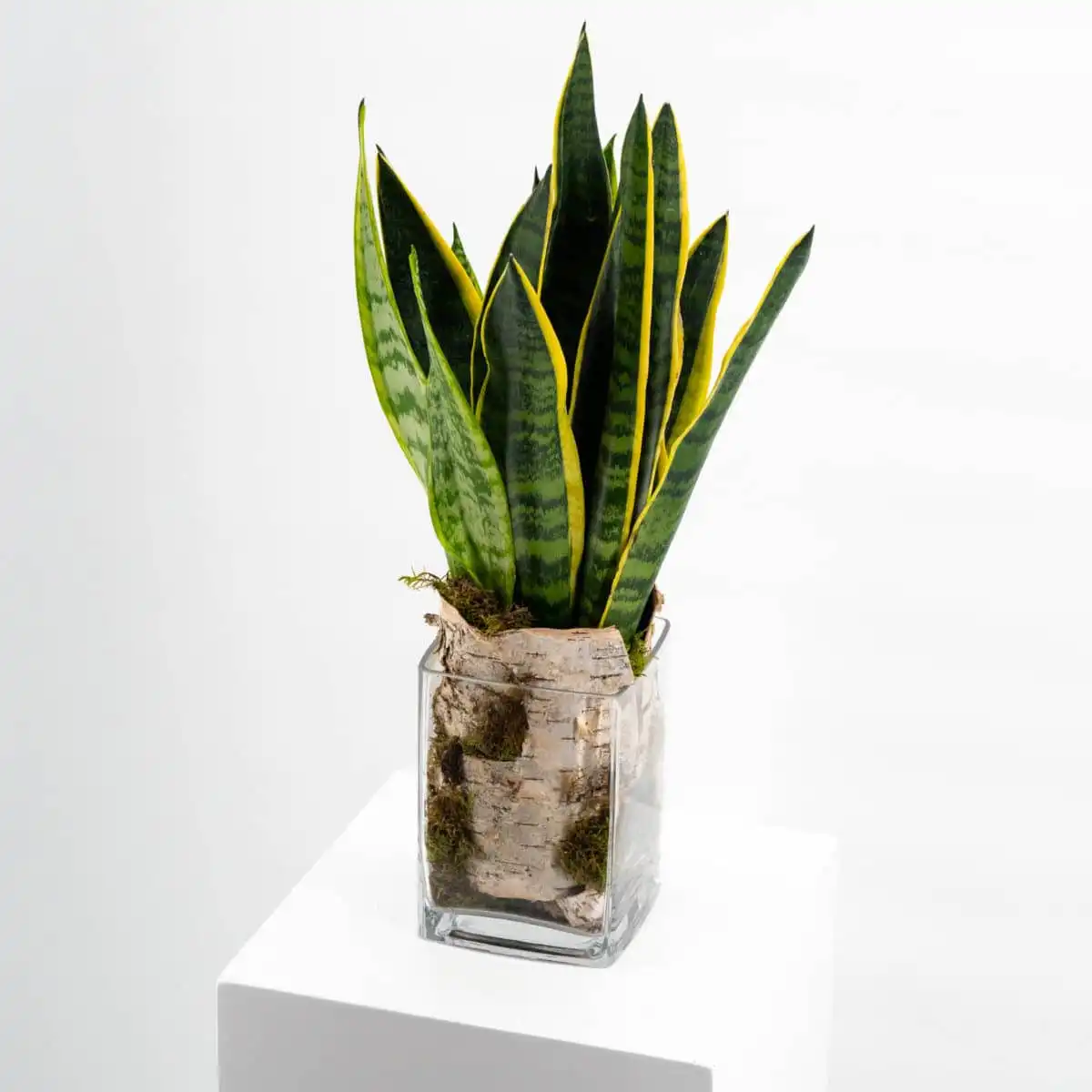 Sanseviera im Topf, im Glasgefäß arrangiert, Topf mit Birkenrindenstücken und Moos Umwickelt.