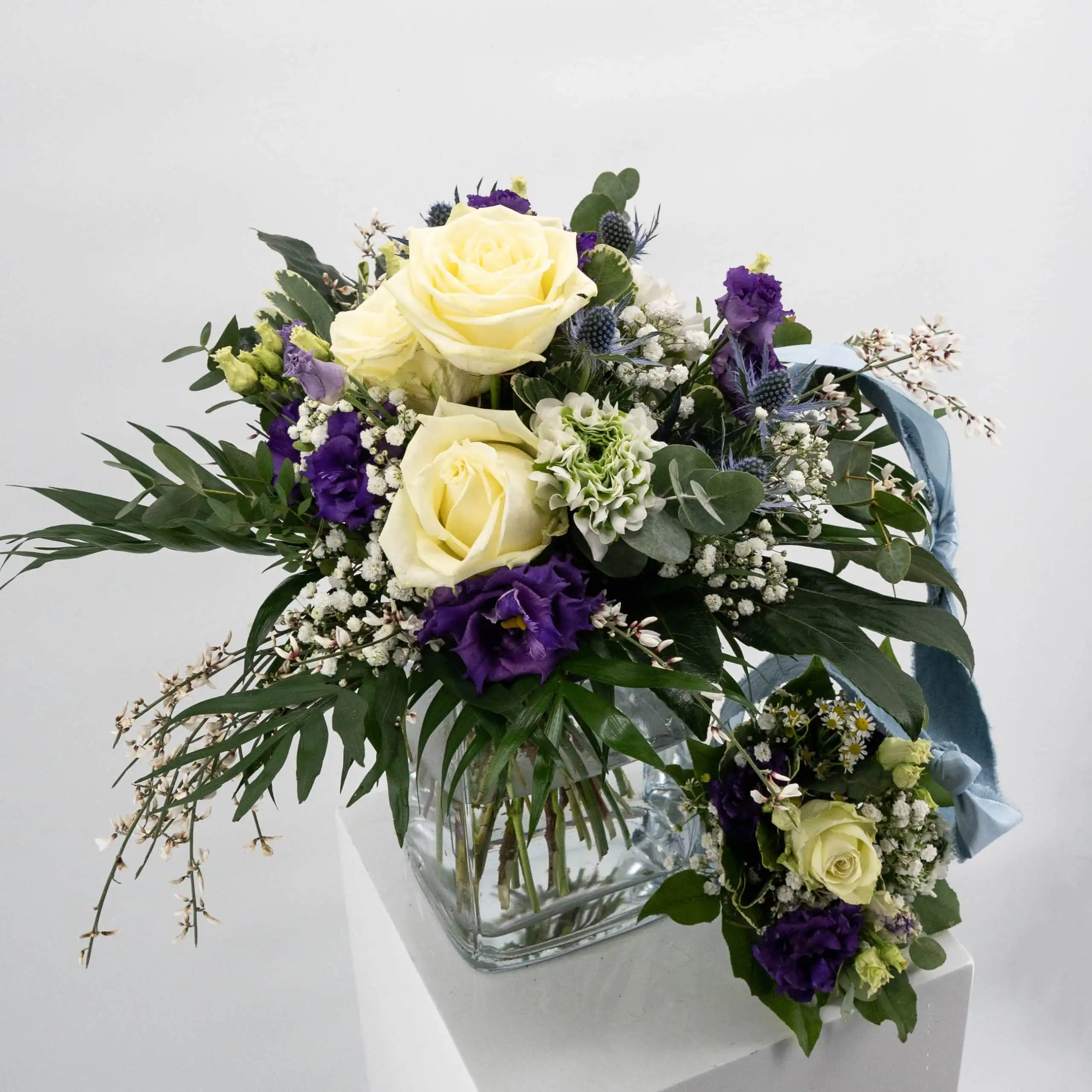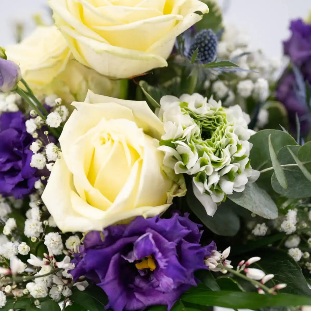 Speziell für die Geburt eines Jungen ist dieses Set liebevoll in Blau und Weiß gehalten. Es besteht aus zwei verschiedengroßen Sträußen, die stilvoll in Szene gesetzt werden – einer für die Mutter, einer für den kleinen Jungen.