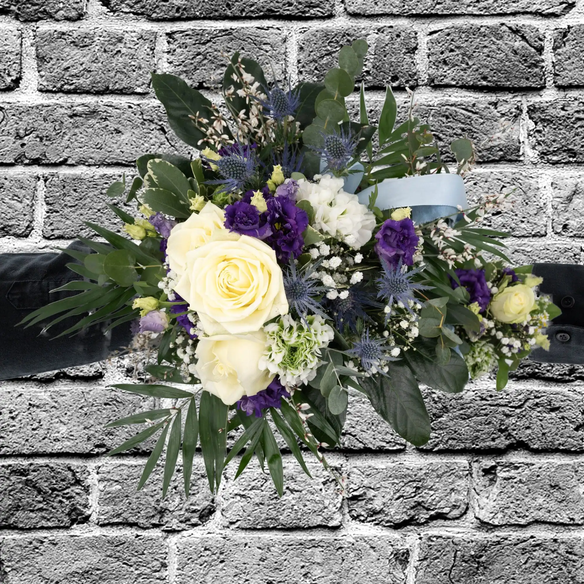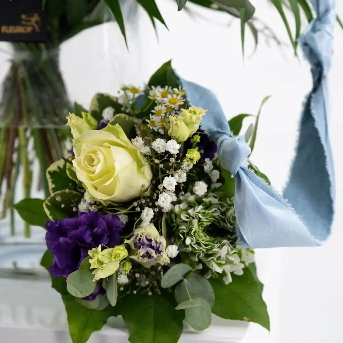 Zwei florale Sträuße unterschiedlicher Größe (ein großer und ein kleiner) „Mutter & Kind Strauß“, verbunden mit blauem Schleifenband. Gebunden werden beide Sträuße in blau/weiß aus z.B. Rosen, Eustoma, Gypsophylla, Disteln, Ranunkeln, Ginster. Als Beiwerk werden Pittosporum, Chico und Eukalyptus verwendet.