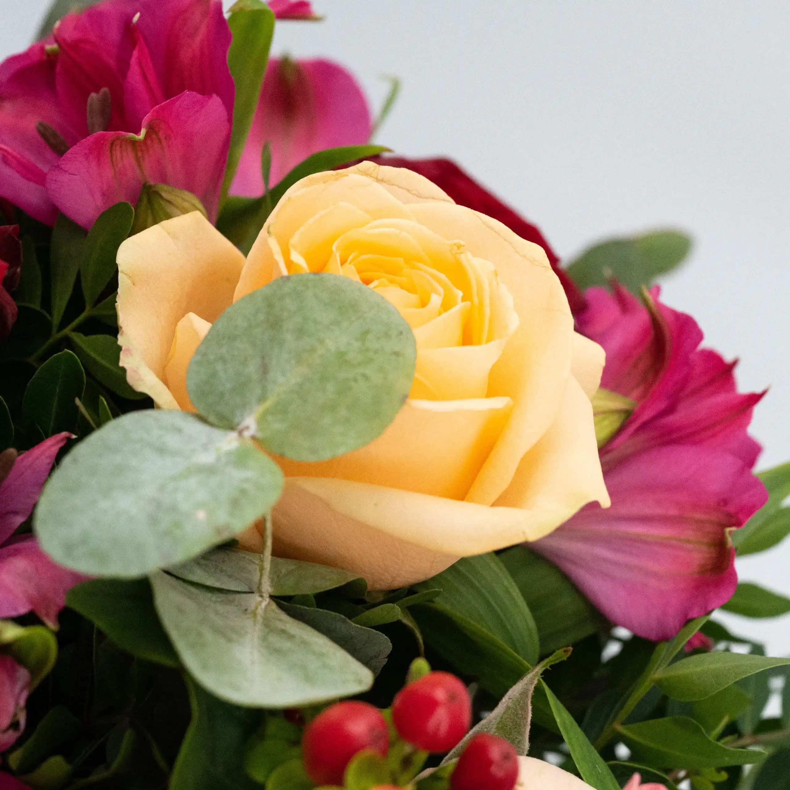 Rundgebundener Strauß bestehend aus großblütigen, edlen roten, apricot und rosa Rosen kombiniert mit Hyperikum, Alstromerien, Eukalyptus und Salal.