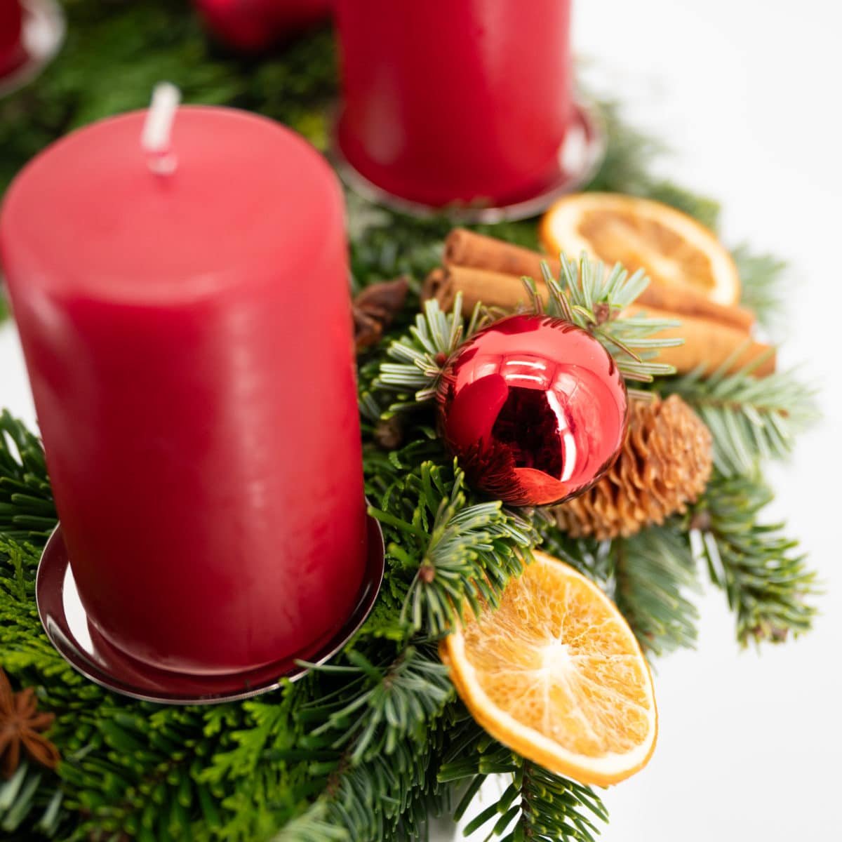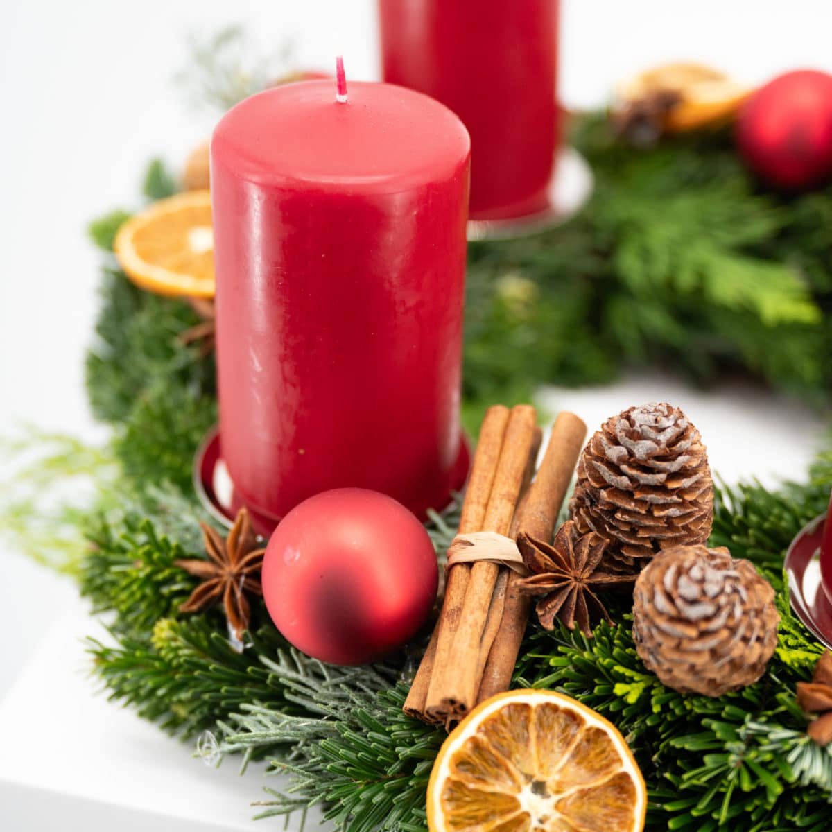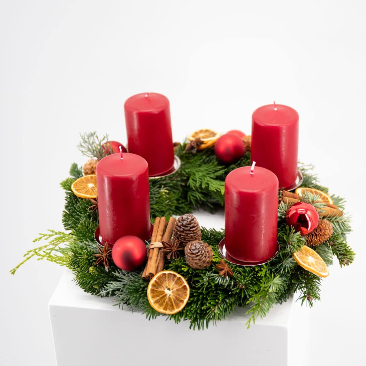 Klassischer Adventkranz aus Konifernmixgrün gewickelt, dekoriert mit 4 roten Kerzen auf