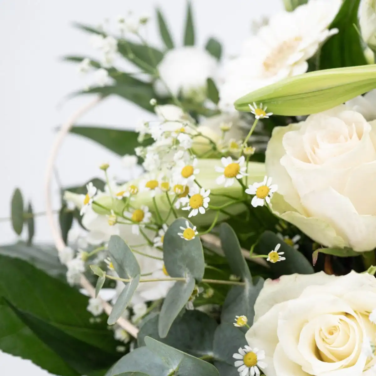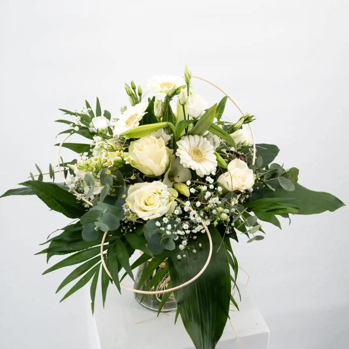 Klassisch, modern rundgebundener Strauß gefertigt aus weißen Lilien, weißen Rosen, Eustoma weiß, Germini, Kamille, Gypsophylla, Eukalyptus, Chico und Apedistrablättern und mit weißem Peddigrohr überzogen.